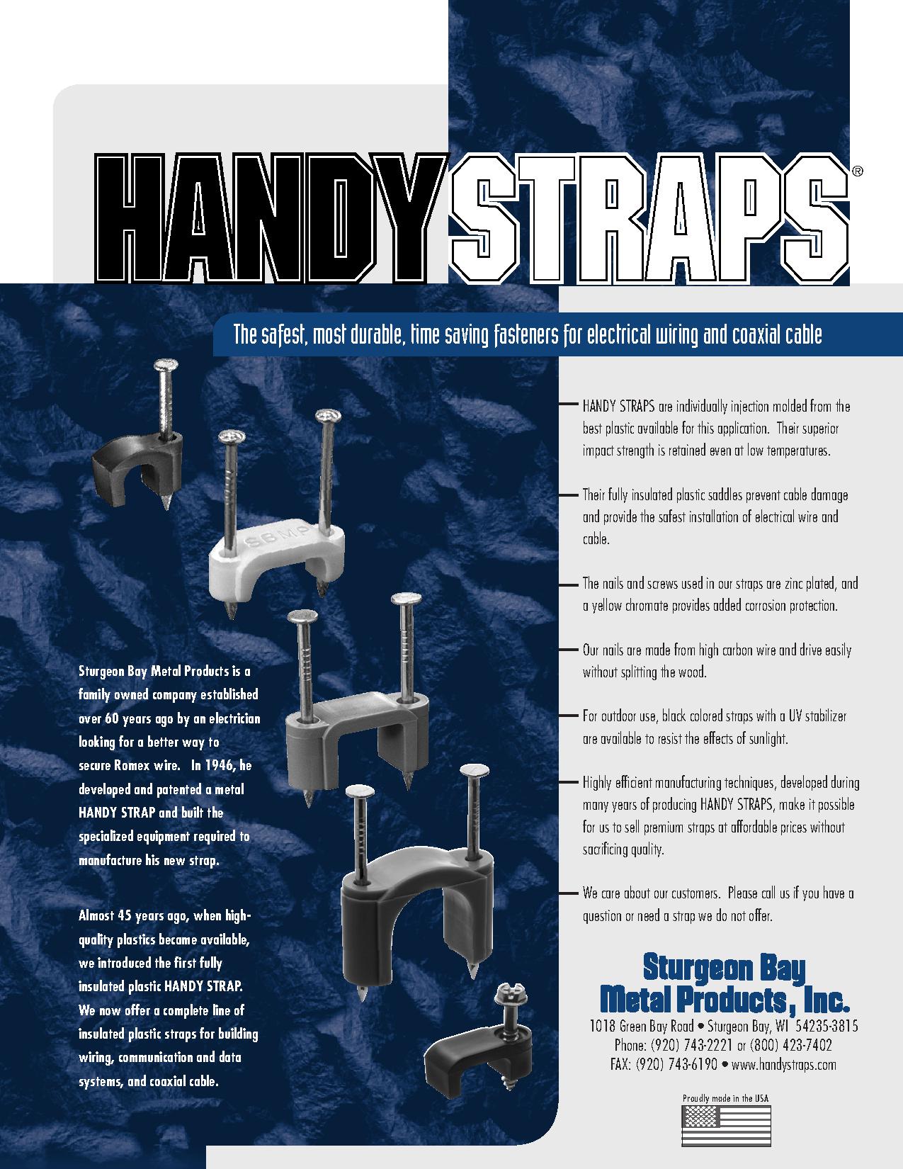 Almost 45 years ago, when high-quality plastics became available, Sturgeon Bay introduced the first fully insulated plastic HANDY STRAP. We now offer a complete line of insulated plastic straps for building wiring, communication and data systems, and coaxial cable.