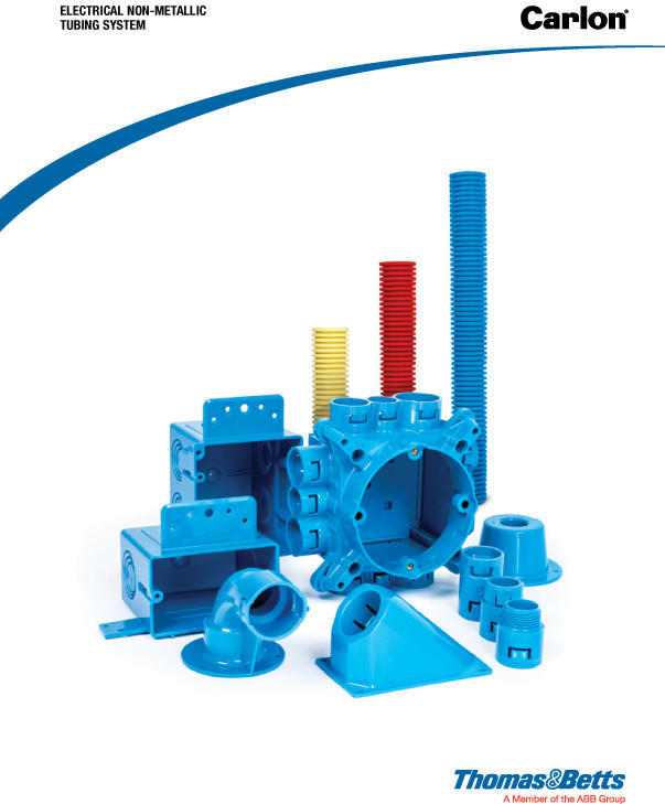 Thomas & Betts Carlon Electrical Non-Metallic Tubing is a pliable raceway that is used in concealed dry locations; concrete slabs; in walls and ceilings; raised floors for information technology equipment; and in buildings exceeding three floors from grade.